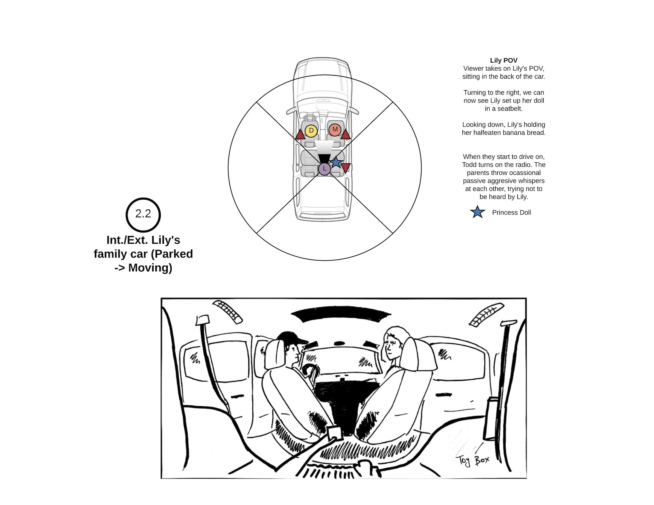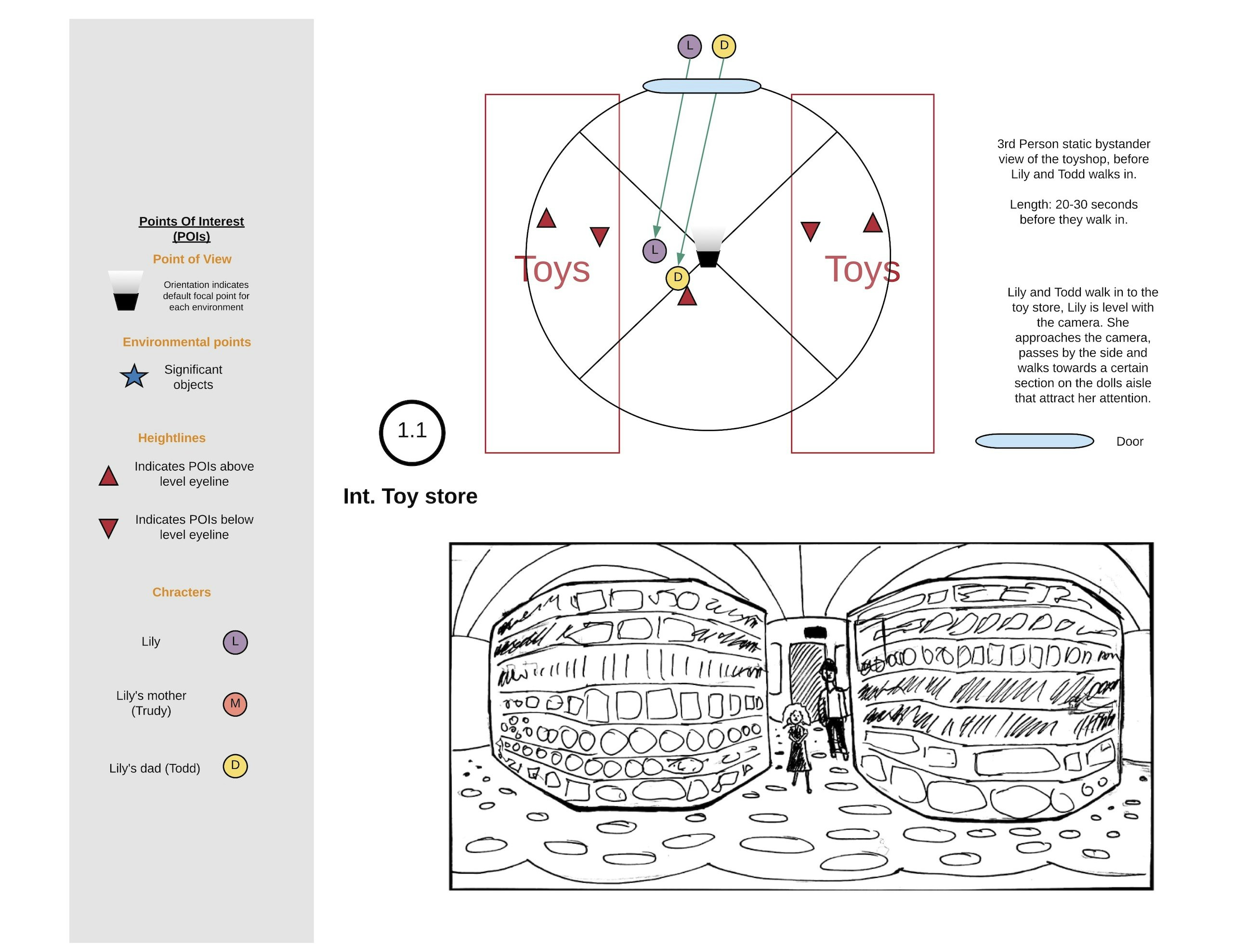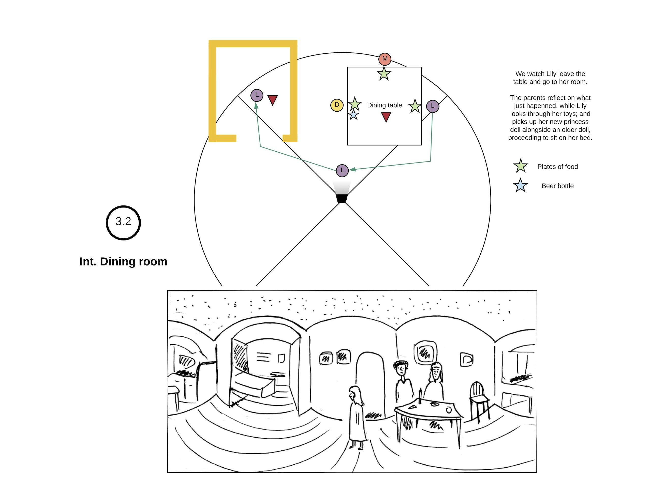 In 360 filmmaking, I like to minimize cuts and allow for the viewer's head or device movement to create flow in the sequence. This means long drawn out sequences that are choreographed around the camera in spatial space. To plan this out, I designed my own system of storyboarding in 360/VR video space, indicating character movement, production design elements, scale and height of signification objects and characters with respect to the viewer POV. Examples below: